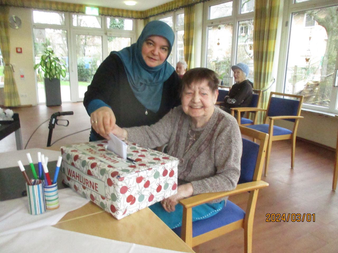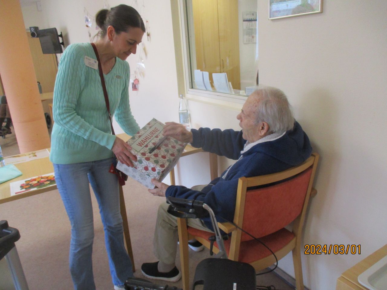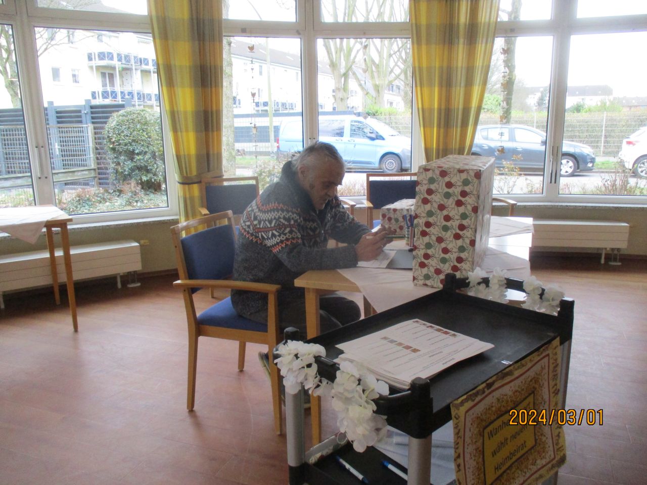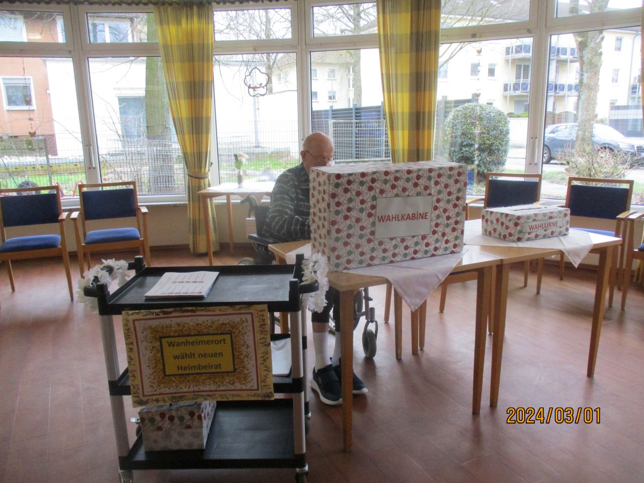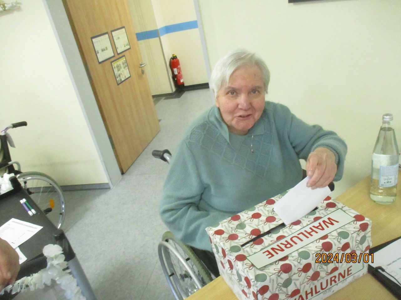 Unsere Bewohner kamen zahlreich in die Cafeteria, der von 10-13 Uhr zum Wahlbüro umfunktioniert wurde. Die Wahl des Heimbeirates stand an und viele interessierten sich dafür. Die Betreuungskräfte übernahmen den Transfer der Bewohner*innen und gingen mit den Stimmzetteln zu den Bewohnern, die aus gesundheitlichen Gründen nicht ins Wahlbüro kommen konnten. Somit konnte jeder der wollte, seine bis zu fünf Stimmen abgeben.